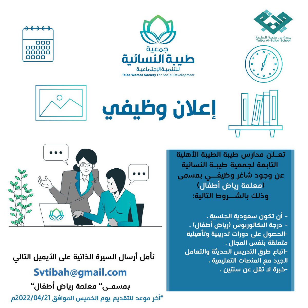 جمعية طيبة النسائية للتنمية الاجتماعية توفر وظائف تعليمية وسائقين، للعمل بالجمعية بالمدينة المنورة، وذلك وفقاً لطريقة التقديم الموضحة أدناه.