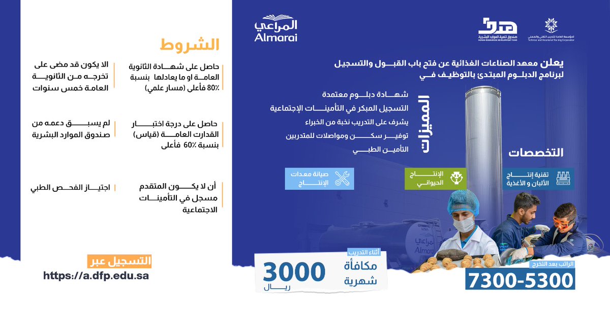 اعلن معهد الصناعات الغذائية فتح باب القبول والتسجيل ببرامج الدبلوم المبتدئة بالتوظيف بشركة المراعي لعام 2023/2022م، لحملة الثانوية العامة أو ما يعادلها، واشترط المعهد أن يكون المتقدم سعودي الجنسية، وذلك وفقاً للتفاصيل وطريقة التقديم الموضحة أدناه.