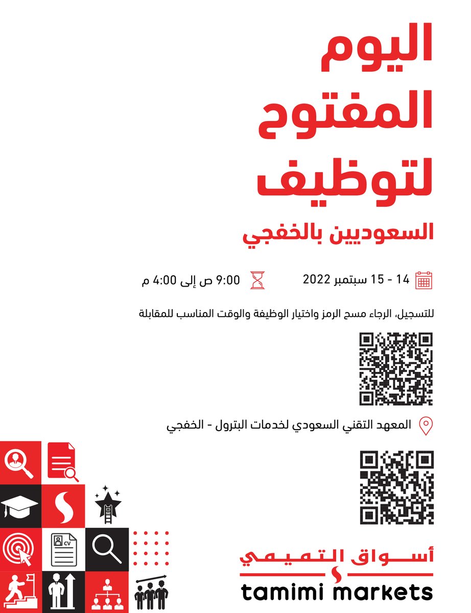 اعلنت أسواق التميمي عن موعد إقامة (اليوم المفتوح للتوظيف بالخفجي) يومي الأربعاء والخميس، وذلك وفقاً للتفاصيل الموضحة أدناه.