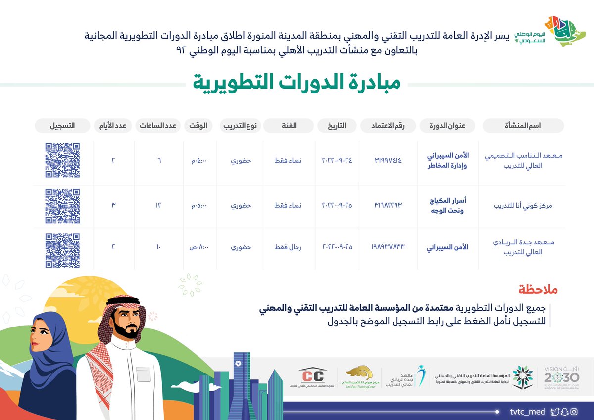 اعلنت الإدارة العامة للتدريب التقني والمهني بمنطقة المدينة المنورة إطلاق مبادرة الدورات التطويرية (المجانية) بالتعاون مع منشآت التدريب الأهلي بمناسبة اليوم الوطني 92، وذلك وفقاً للتفاصيل الموضحة أدناه.