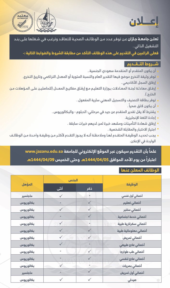 اعلنت جامعة جازان توفر وظائف صحية (رجال / نساء) للتعاقد وترغب في شغلها على بند التشغيل الذاتي، واشترطت الجامعة أن يكون المتقدم أو المتقدمة سعودي الجنسية، وذلك وفقاً للتفاصيل وطريقة التقديم الموضحة أدناه.