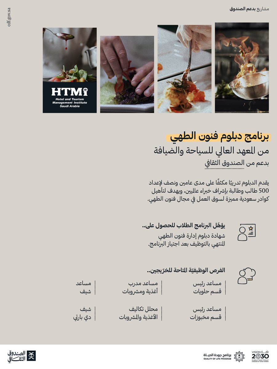 اعلن المعهد العالي للسياحة والضيافة بدء التقديم (رجال / نساء) برنامج (دبلوم فنون الطهي) المنتهي بالتوظيف (مدعوم من الصندوق الثقافي)، لتعزيز نمو وازدهار مجالات الطهي والضيافة، وخلق فرص عمل واعدة لصناع الثقافة، وذلك وفقاً للتفاصيل الموضحة أدناه.