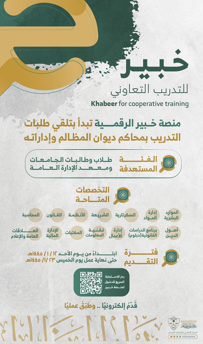 ديوان المظالم موعد بدء التقديم في برنامج (التدريب التعاوني) عبر (منصة خبير الرقمية)، لطلاب وطالبات الجامعات والكليات ومعهد الإدارة العامة في برنامج التطبيق العملي في عموم محاكِمه وإداراته بجميع مناطق المملكة، وذلك وفقاً للتفاصيل الموضحة أدناه.