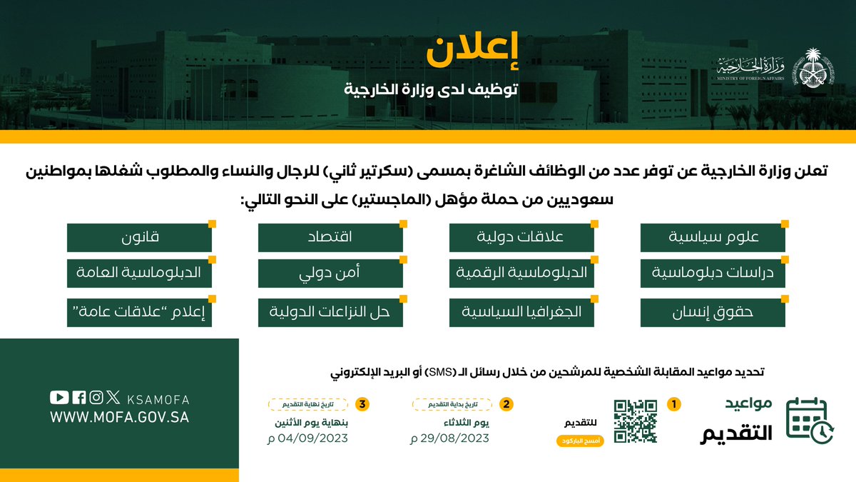 اعلنت وزارة الخارجية عن توفر عدد من الوظائف الشاغرة بمسمى “سكرتير ثاني” للرجال والنساء والمطلوب شغلها بمواطنين سعوديين من حملة مؤهل “الماجستير”، وذلك وفقاً للتفاصيل الموضحة أدناه.