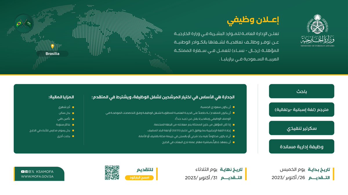 اعلنت وزارة الخارجية عن وظائف تعاقدية (رجال / نساء) بسفارة المملكة في برازيليا، وذلك وفقاً للتفاصيل الموضحة أدناه.