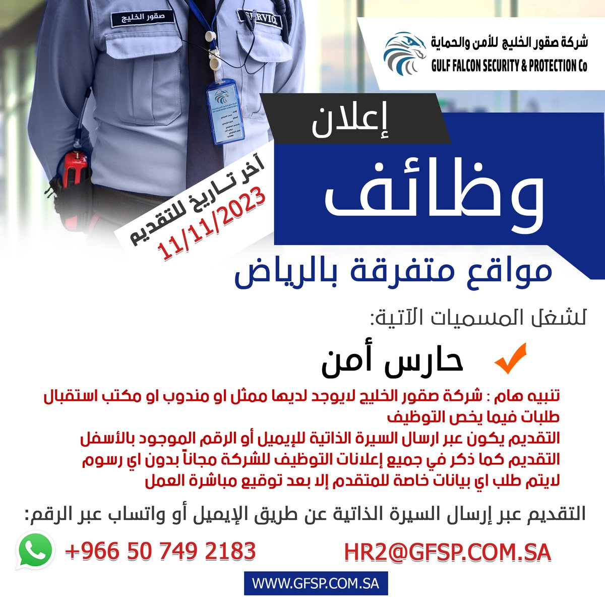 شركة صقور الخليج للحراسات الأمنية فتح التوظيف بمجال الحراسات الأمنية بالرياض، وذلك وفقاً للتفاصيل وطريقة التقديم الموضحة أدناه.